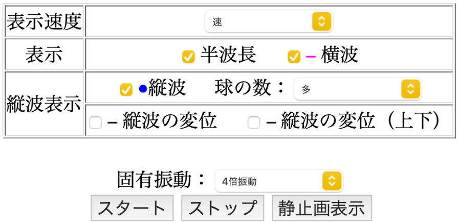 縦波:縦波が青球で表示されます.球の数は「多・少」から選択できます.