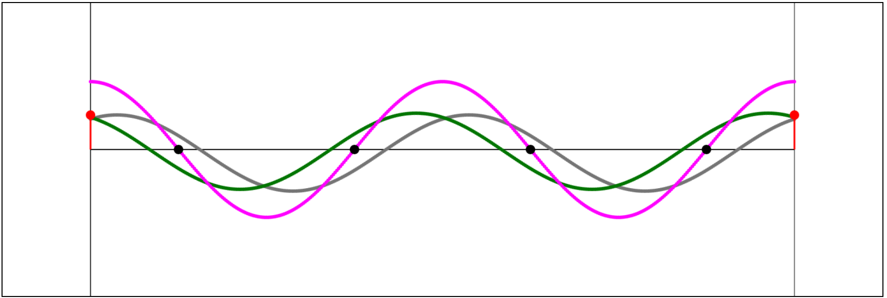 それぞれの波が重なって見えにくくならないように,それぞれの波形を少しy軸方向にずらす操作を行っているため,不連続に見える瞬間があるかもしれません.この動画では両端は腹(両端の波源の振動が同位相,波源間隔が2λのため)だが,定常波は必ず両端(波源)が腹になるわけではないことに注意してください.
