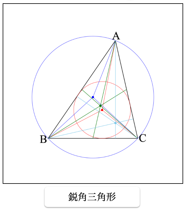 図の下に三角形ABCの種類(正三角形・二等辺三角形・直角三角形・鋭角三角形・鈍角三角形)を示しています.