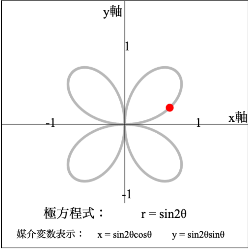 赤球が描く軌跡(灰色線)が正葉曲線です.