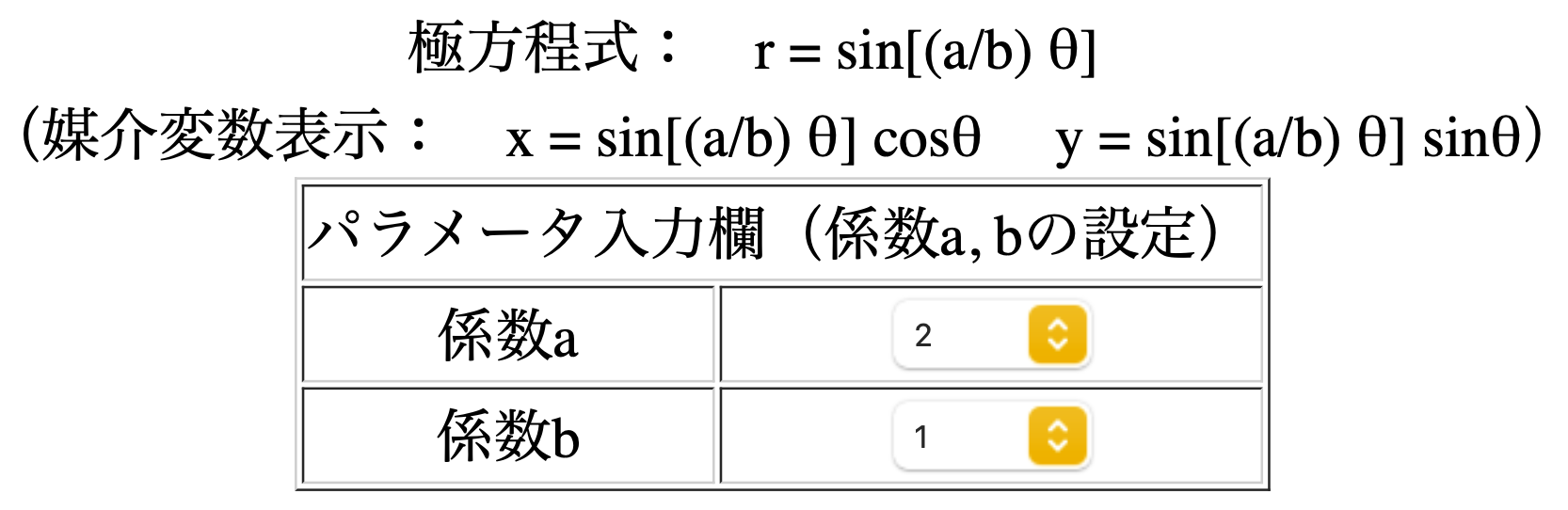 正葉曲線の極方程式: r = sin[(a/b) θ]※「x=rcosθ,y=rsinθ」で直交座標に変換した媒介変数表示で軌跡を描いています.