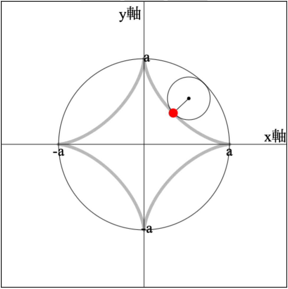 アステロイドとは,半径a/4の円が,半径aの固定円に内接しながら滑らずに回転するときの,ある1点が描く曲線である.ちなみに,小惑星(はやぶさ2が探査したリュウグウなど)も英語でアステロイドです.