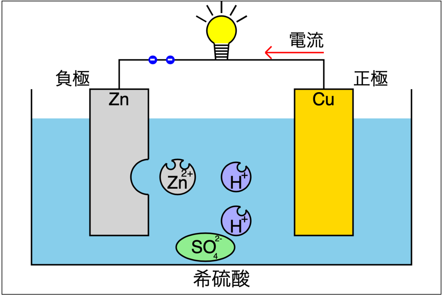 酸化還元反応によって放出される化学エネルギーを電気エネルギーに変換して取り出す装置を電池という.負極で酸化反応が生じ,導線に向かって電子が流れ出し,正極で電子を受け取り,還元反応が生じる.