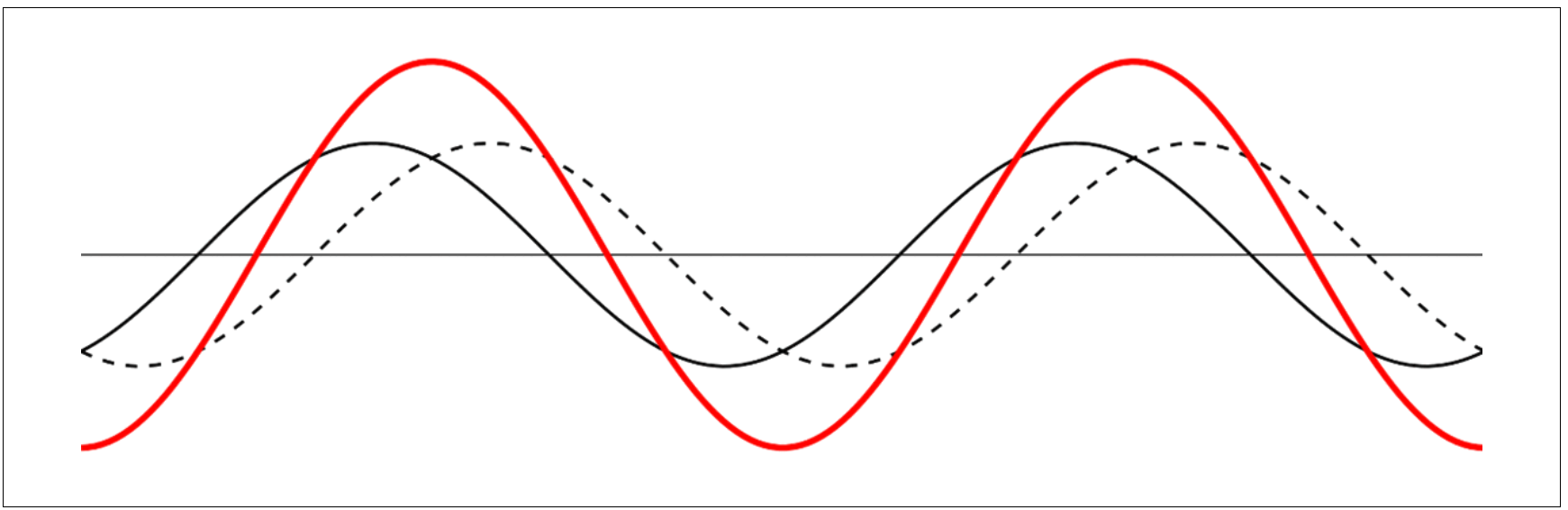 波長・速さ・振幅が等しい2つの波が,一直線上を逆向きに進むとき,定常波が生じる.2つの波の合成波の変位を重ね合わせの原理により求めると,進まない波ができる.最も振幅が大きい位置を腹, 振幅が常に0の位置を節という.