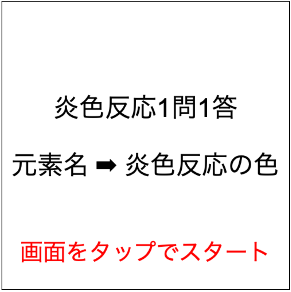 炎色反応について,「元素名」に対応する「炎色反応の色」を答えるものです.炎色反応の暗記にご活用ください.