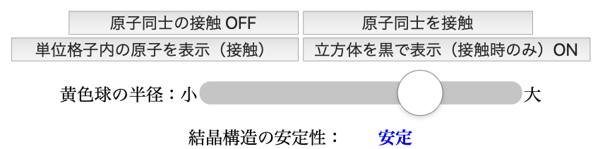 黄色の球の半径を変更すると結晶構造の安定性が上部に表示されます(安定/不安定).