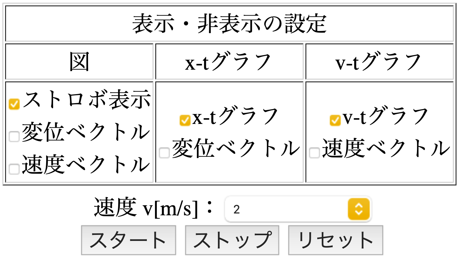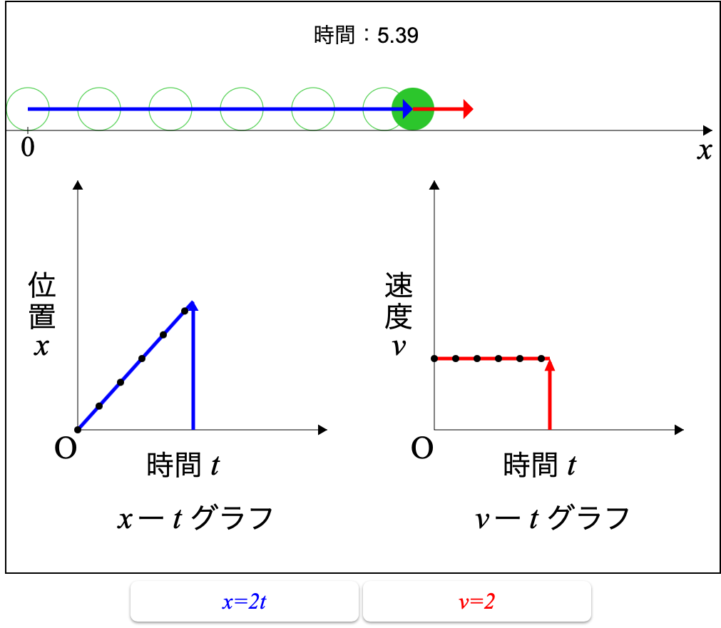 速度を設定すると,x-tグラフの式(青)とv-tグラフの式(赤)が動作画面の下に表示されます.
