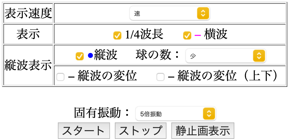 縦波:縦波が青球で表示されます.球の数は「多・少」から選択できます.