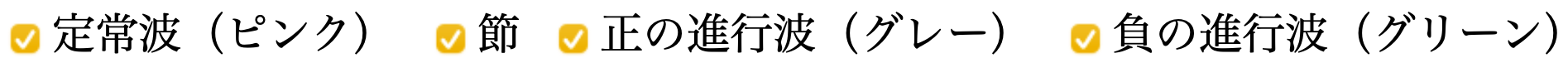 それぞれの波が重なって見えにくくならないように,それぞれの波形を少しy軸方向にずらす操作を行っているため,不連続に見える瞬間があるかもしれません.この動画では両端は腹(両端の波源の振動が同位相,波源間隔が2λのため)だが,定常波は必ず両端(波源)が腹になるわけではないことに注意してください.