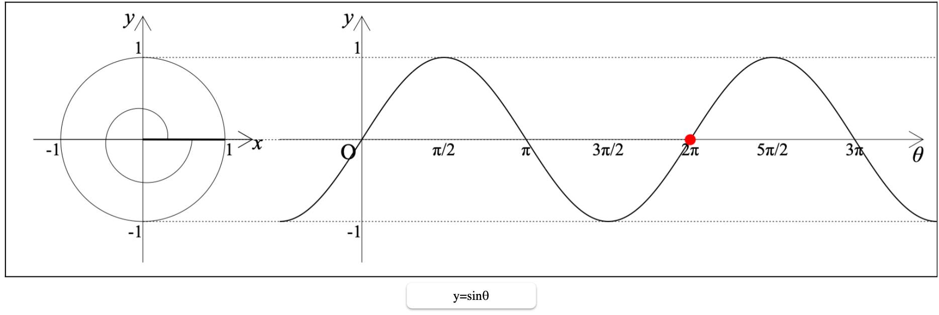 右図:三角関数のグラフ.赤球が「表示方法の入力欄」の「一般角θの値」で指定した角度まで進みます(ここでは2πまで).