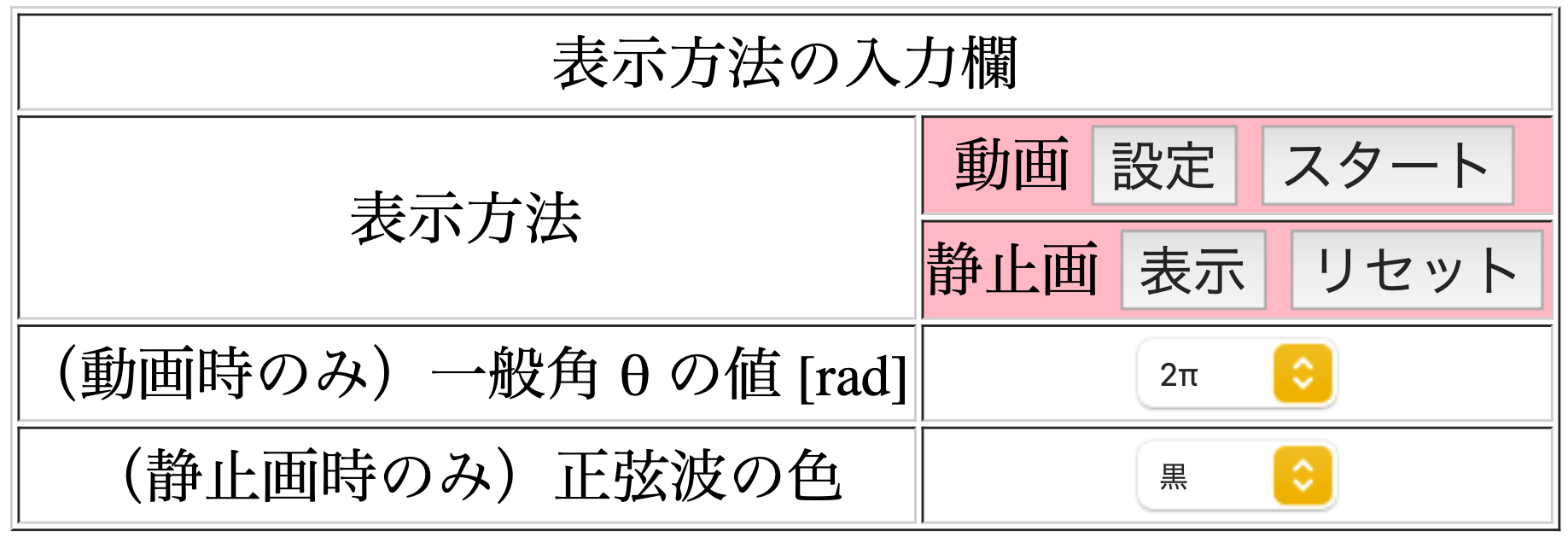 静止画:「表示」をクリックすると,前の関数に重ねて表示され,「リセット」で関数が削除されます. 「正弦波の色」の設定で重ねて表示する正弦波の色を変更できます.単位円との対応は表示していません.